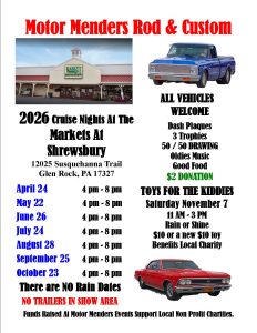 Why Go: One of the most popular cruise-ins in York County, Cruise Nights at the Markets at Shrewsbury runs on the fourth Friday of every month, April through October, hosted by the Motor Menders Rod and Custom Club. April 24th opens the 2026 season. Hundreds of custom vehicles fill the parking lot, dash plaques go to the first one hundred and twenty-five registered cars, and three trophies are awarded. All makes and models welcome. No rain dates in 2026. Step inside the Markets afterward for great food.