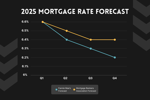 Fannie Mae predicts mortgage rates to average 6.4% in 2025. Mortgage Bankers Association also predicts mortgage rates to average 6.4%, but with slightly higher rates compared to Fannie’s forecast.