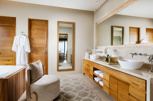If you’re undertaking a renovation, consider upgrading fixtures and materials. Handmade tile and custom cabinetry can add a touch of style and luxury. Trade stark whites for warm neutrals to create a more relaxed feel—think light wood tones, creams, and beiges.3 Complete the look with soft ambient lighting from a backlit mirror or pair of decorative sconces.2,3